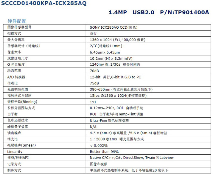 140萬像素,2/3” SONY彩色CCD傳感器,USB2.0 C接口
