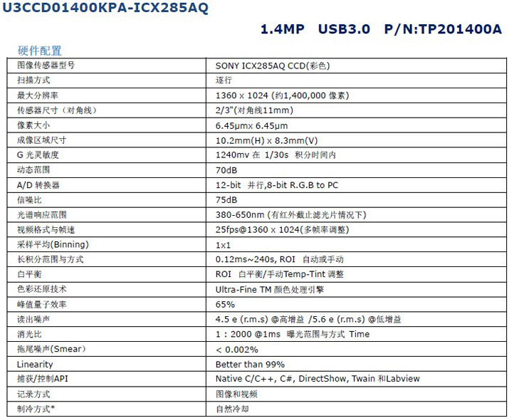 140萬像素,2/3” SONY彩色CCD傳感器,USB3.0 C接口