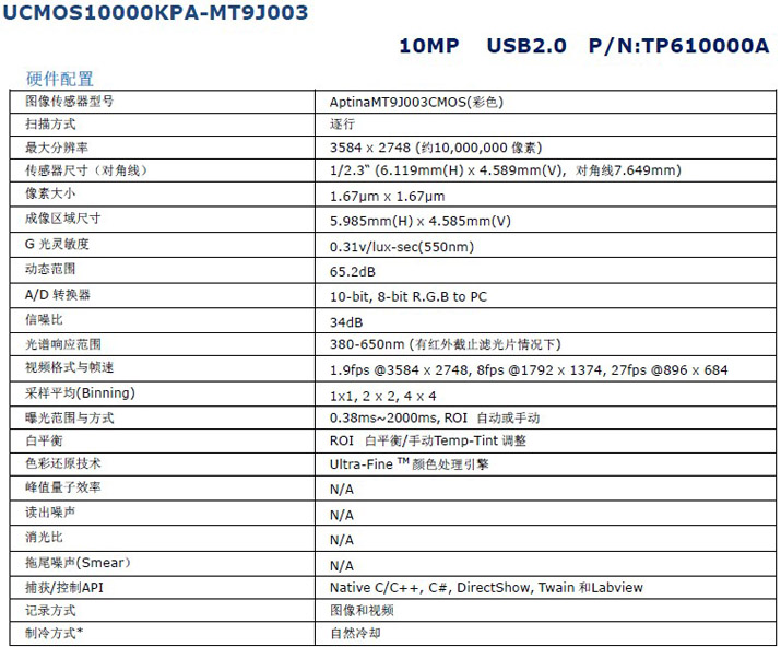 1000萬像素,1/2.3” Aptina彩色CMOS傳感器,USB2.0 C接口