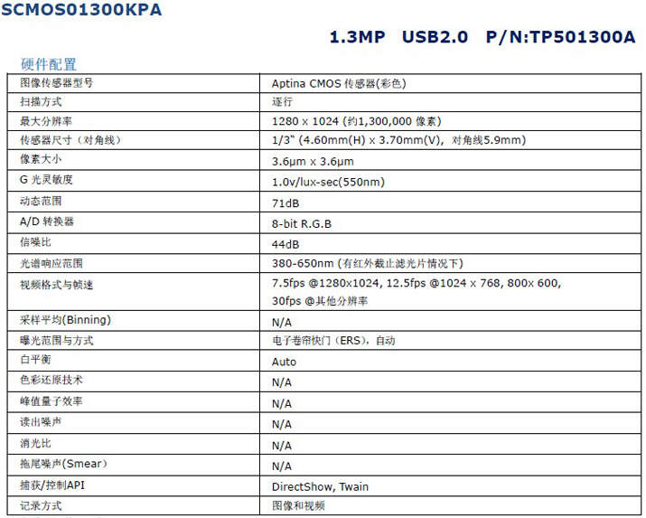 130萬像素,1/3” Aptina彩色CMOS傳感器,USB2.0