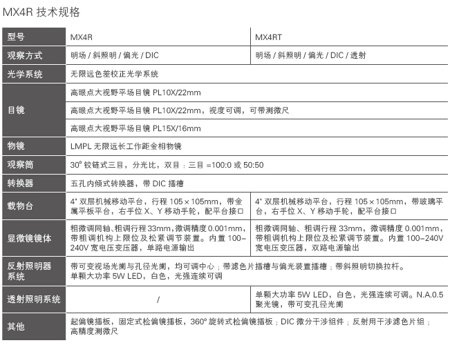 性能特點(diǎn) 1)MX4R系列為新型FPD檢查顯微鏡,專為L(zhǎng)CD行業(yè) / TFT玻璃 / COG導(dǎo)電粒子壓痕、粒子爆破檢查 2)MX4R系列機(jī)型采用4寸、6寸平臺(tái)設(shè)計(jì),可適用于相應(yīng)尺寸的晶圓或小尺寸樣品的金相檢查 3)MX4R系列,其微分干涉效果可與進(jìn)口品牌相媲美 4)MX4R系列機(jī)型采用新設(shè)計(jì)的長(zhǎng)工作距物鏡、半復(fù)消色差技術(shù),多層寬帶鍍膜技術(shù),采用長(zhǎng)壽命LED光源 5)多種高度功能化的附件,能滿足各種檢驗(yàn)需要,可用于明場(chǎng)、簡(jiǎn)易偏光、微分干涉觀察